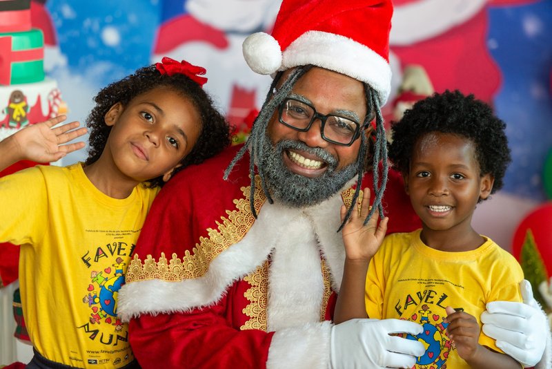 Alegria, muitas cores e representatividade. Esse foi o cenário do “Natal Mágico” realizado para cerca de 900 crianças moradoras do Caju e da Cidade de Deus. Em sua oitava edição, as comemorações do Projeto Favela Mundo tiveram a visita ilustre do Papai Noel negro, que acompanhado de seus assistentes, presenteou os alunos da instituição com livros, com objetivo de reforçar a importância da educação e da leitura. Como tradição, durante as celebrações, o ator, escritor e diretor Rodrigo França deu vida ao “Bom Velhinho”