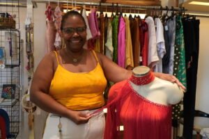 “Soube das aulas do projeto quando entrei aqui no Espaço pela primeira vez. Eu costurava roupas e não colocava para venda, foi a galera do Lidera que me incentivou a começar. Elas gostaram da roupa que eu estava vestindo, falei que tinha sido feita por mim e ficaram encantadas. Desde então, eu aprendi muito no curso. Hoje produzo não só roupas para o dia a dia, mas também para o Carnaval, minha neta é porta-bandeira mirim e eu aprendi a elaborar essas peças,” contou.