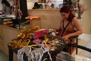 A equipe do espaço sempre decora e põe em destaque itens especiais para cada época do ano. Com o Carnaval se aproximando, é possível encontrar à venda tops customizados com paetê, brincos de fitas, arcos decorados e roupas carnavalescas.