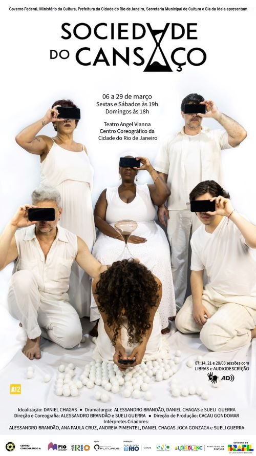 Com direção e coreografia de Alessandro Brandão e Sueli Guerra, “Sociedade do Cansaço” foi idealizado por Daniel Chagas a partir do livro homônimo de Byung-Chul Han e propõe uma investigação cênica sobre o que o autor denomina “sociedade do desempenho” — marcada por aceleração constante, ansiedade, fragmentação e estados depressivos. Ao mesmo tempo em que expõe esses sintomas do nosso tempo, a obra busca resgatar conceitos, ritmos e culturas que se colocam em oposição a esse modelo hegemônico de vida. Por meio dessa contraposição, o elenco, formado por Alessandro Brandão, Ana Paula Cruz, Andreia Pimentel, Joca Gonzaga, Daniel Chagas e Sueli Guerra, não oferece respostas ou conclusões fechadas no palco, mas abre espaços de reflexão e propõe novas formas de lidarmos com a contemporaneidade, convidando o público a uma experiência sensorial, crítica e afetiva. Por que é tão difícil desacelerar ou permanecer imóvel?