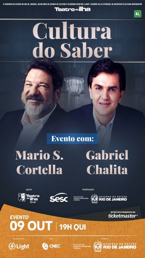 Em mais uma iniciativa que reforça seu compromisso conjunto com a valorização da educação e da cultura, a Secretaria de Estado de Cultura e Economia Criativa do Rio de Janeiro (SececRJ) e o Sesc RJ realizam, no dia 9 de outubro, às 19h, no Teatro da Ilha, o encontro Cultura do Saber. O evento marca as comemorações do Dia do Professor e homenageia educadores de todo o estado, reunindo grandes nomes do pensamento brasileiro em uma noite de reflexão, troca de ideias e reconhecimento à importância do magistério. A entrada é gratuita, com ingressos disponíveis exclusivamente na página do Teatro da Ilha no Instagram: https://instagram.com/teatrodailha