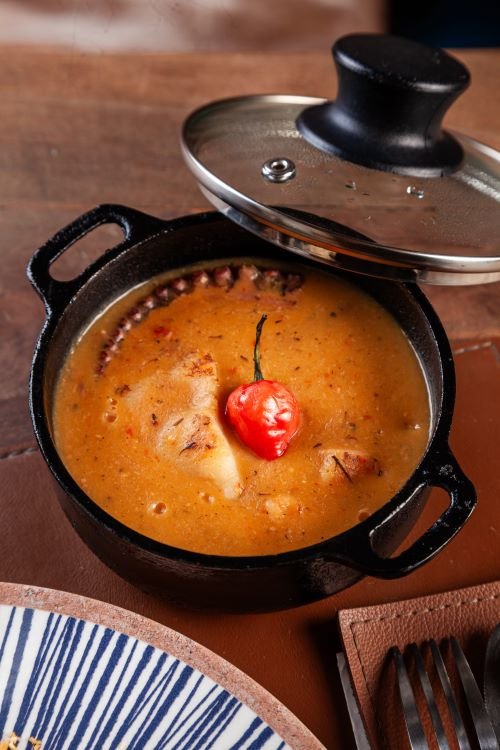 Preparada com peixe do dia e frutos do mar, a moqueca é envolvida por um molho quente, aromático e bem estruturado, respeitando a tradição do prato sem abrir mão de um olhar contemporâneo. A experiência se completa com arroz branco fresco, pirão, farofa e molho de pimenta, acompanhamentos que reforçam a identidade brasileira da receita e tornam a degustação ainda mais envolvente.