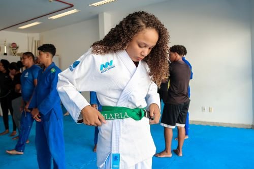 As aulas de jiu jitsu, através do Projeto Transformar, garantem mais chances de um futuro feliz para crianças e jovens da cidade. Maria Alice, de 15 anos, expressou gratidão pela iniciativa da Prefeitura de Itaboraí.