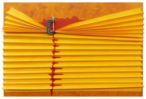 Há também uma série com nove obras amarelas em caixa de acrílico nas quais o artista coloca elementos diversos, como um prumo (instrumento usado na construção civil para garantir a verticalidade de estruturas), bolas de tênis pintadas de preto e placas de chumbo. “Nesta coletânea uso uma série de linguagens com vários suportes diferenciados, que vão da aquarela à escultura, tudo dentro de caixas de acrílico. As placas de chumbo, por exemplo, são marteladas e costuradas na madeira para dar um aspecto de matéria orgânica”, explica o artista.